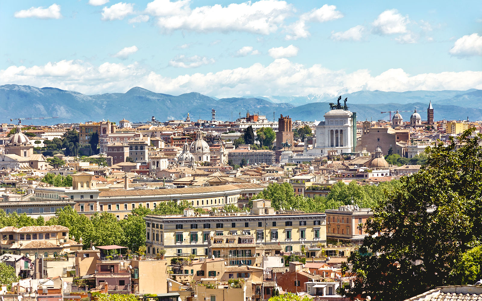 Beobachten Sie die ikonischen Monumente und Dächer Roms vom erhöhten Aussichtspunkt der Terrazza Italia.