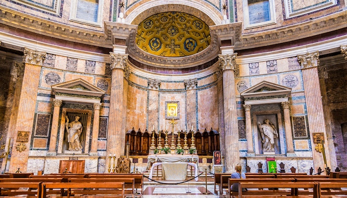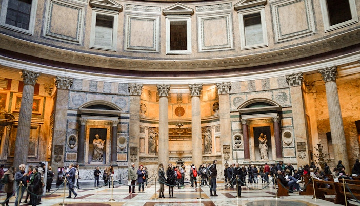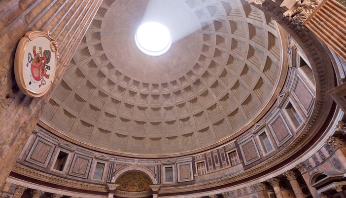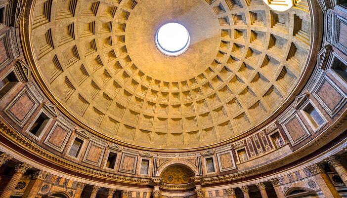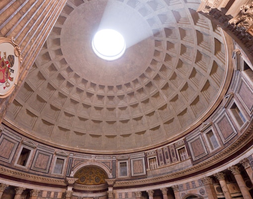 Lo spazio principale del Pantheon è la grande rotonda, un'enorme sala circolare con un diametro di circa 43,3 metri (142 piedi). La cupola della rotonda svetta in alto, raggiungendo un apice al centro, dove l'oculus, un'apertura circolare con un diametro di circa 8,8 metri (29 piedi), permette a un flusso di luce di entrare nel tempio.