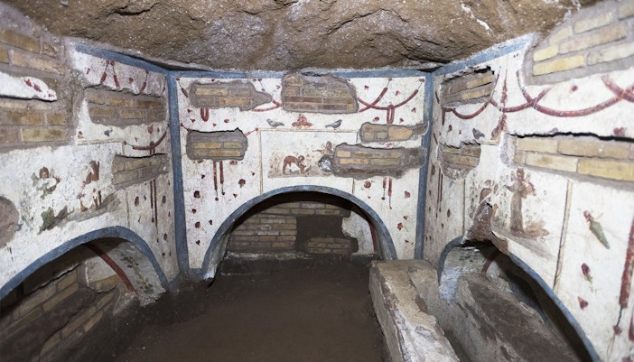- Viktiga funktioner: Invecklade tunnlar, Sankt Sebastians Kryptor, Intrikata fresker från 400-talet i Jonas gravkammare och återanvända hedniska mausoleer som ställer ut biblisk och historisk konst.